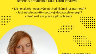 Zveme Vás na besedu s paní JUDr. Ditou Vávrovou, která nás seznámí s možnostmi, jak se bránit nepoctivým obchodníkům. V podkroví knihovny 10. 4. od 17:00 hodin.