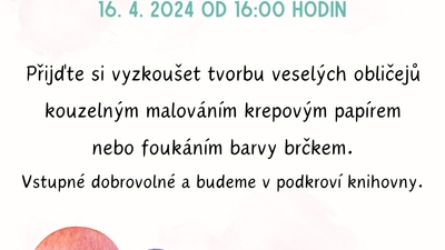 Do podkroví knihovny na Knihovnické vyrábění jsou zvány všechny děti i jejich rodiče, kteří chtějí trávit čas kreativně a nasbírat inspiraci. Přijďte si vyzkoušet tvorbu veselých obličejů kouzelným malováním krepovým papírem či foukáním barvy brčkem. Vstupné je dobrovolné a vše pro vás bude připraveno.
