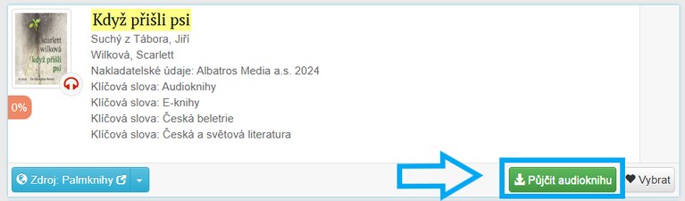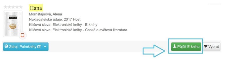 5) Vyhledejte si v katalogu Vámi požadovaný titul a pokud je k dispozici jako e-kniha/audiokniha, klikněte na tlačítko „Půjčit e-knihu“ u Vámi vybraného titulu.