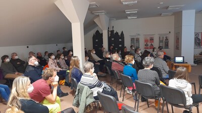 Beseda s Mgr. Petrem Kafkou, zoologem z CHKO Broumovsko, která proběhla 24.2. 2022. Podkrovní sál byl zaplněný téměř do posledního místa.